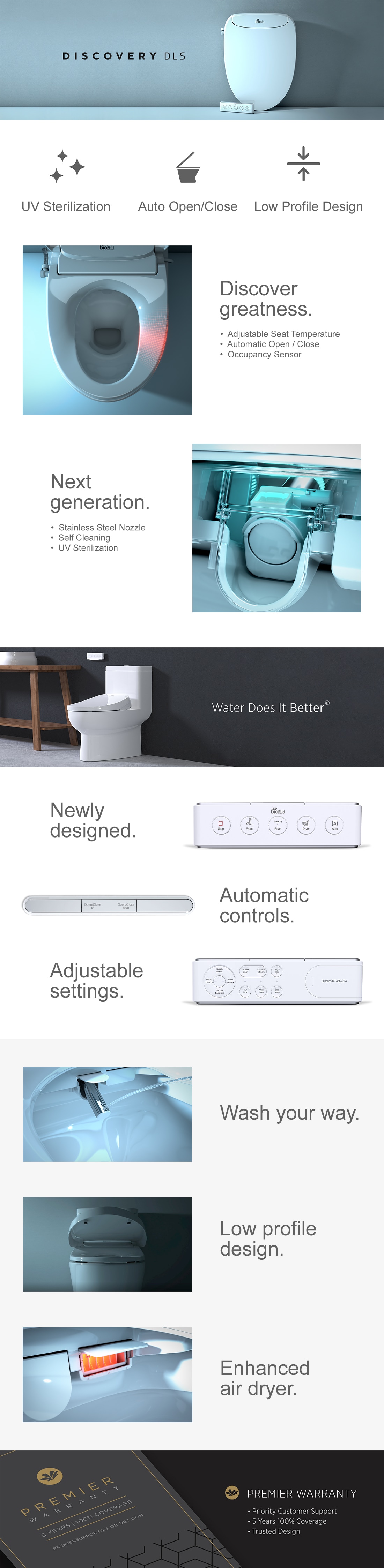 Introducing the next generation of bathroom technology – The Bio Bidet Discovery series DLS bidet seat. Boasting features such as UV sterilization, automatic open/close, and luxury bidet controls, the Discovery DLS heralds a new era of advanced personal hygiene in the comfort of your own home. Compatible with most toilets, the low profile design enhances the beauty and function of your bathroom. Choose from a variety of wash options, including water temperature, water pressure, spray pattern, and nozzle position. The enhanced warm air dryer mitigates the need for toilet paper, and the built-in night light illuminates a safe destination for late night trips to the bathroom. Say goodbye to toilet paper, and say hello to a cleaner, healthier lifestyle