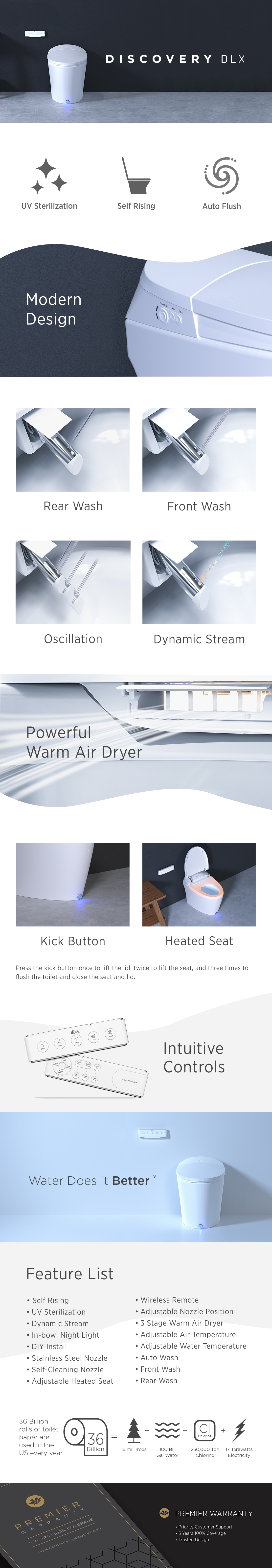 Introducing the next generation of bathroom technology - The Bio Bidet Discovery series DLX bidet toilet. Boasting features such as UV sterilization, automatic open/close and luxury bidet controls, the Discovery DLX heralds a new era of advanced personal hygiene in the comfort of your own home. Easily open the lid, seat and flush the toilet with the convenient kick control located at the base of the toilet. Choose from a variety of wash options, including water temperature, water pressure, spray pattern and nozzle position. The enhanced warm air dryer mitigates the need for toilet paper and the built-in night light illuminates a safe destination for late night trips to the bathroom. Say goodbye to toilet paper and say hello to a cleaner, healthier lifestyle.
